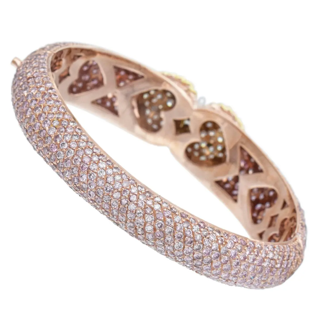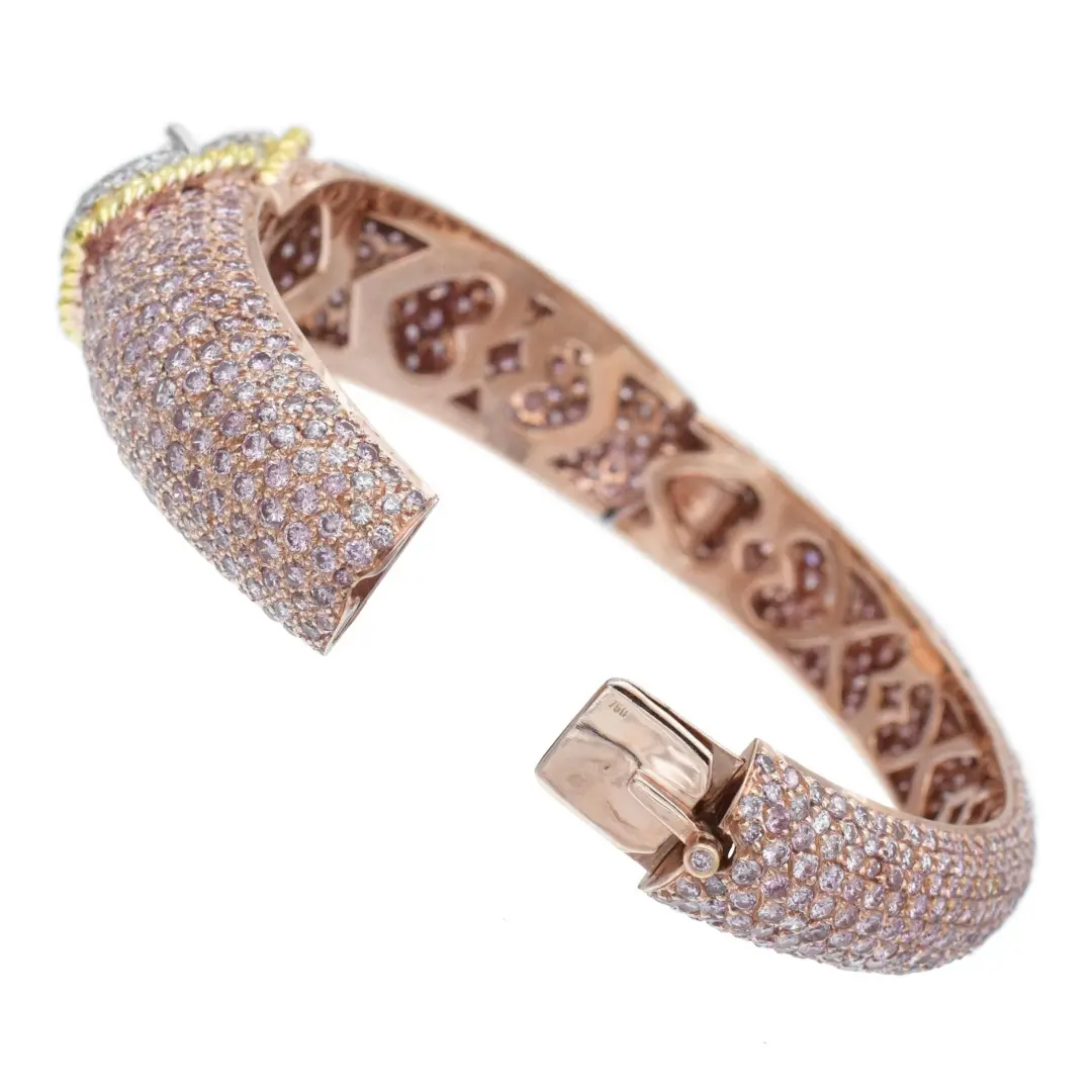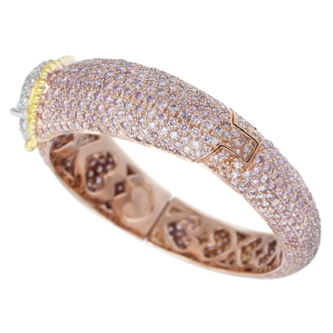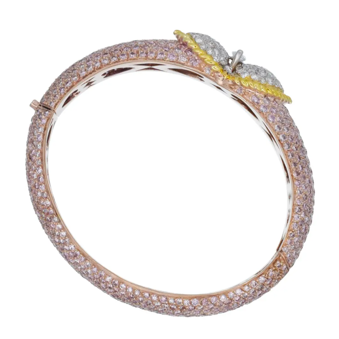 This exquisite bangle features approximately 660 round pink diamonds totaling around 20 carats, complemented by 68 round white diamonds totaling about 2 carats, and a single marquise-cut diamond of approximately 1 carat. Each diamond is meticulously handset to achieve perfect symmetry and brilliance. The intricate arrangement highlights the natural charm of the pink stones while the white diamonds add a radiant contrast. The inner band is smoothly polished for comfort, and the exterior radiates sophistication with its seamless transitions between three gold tones.