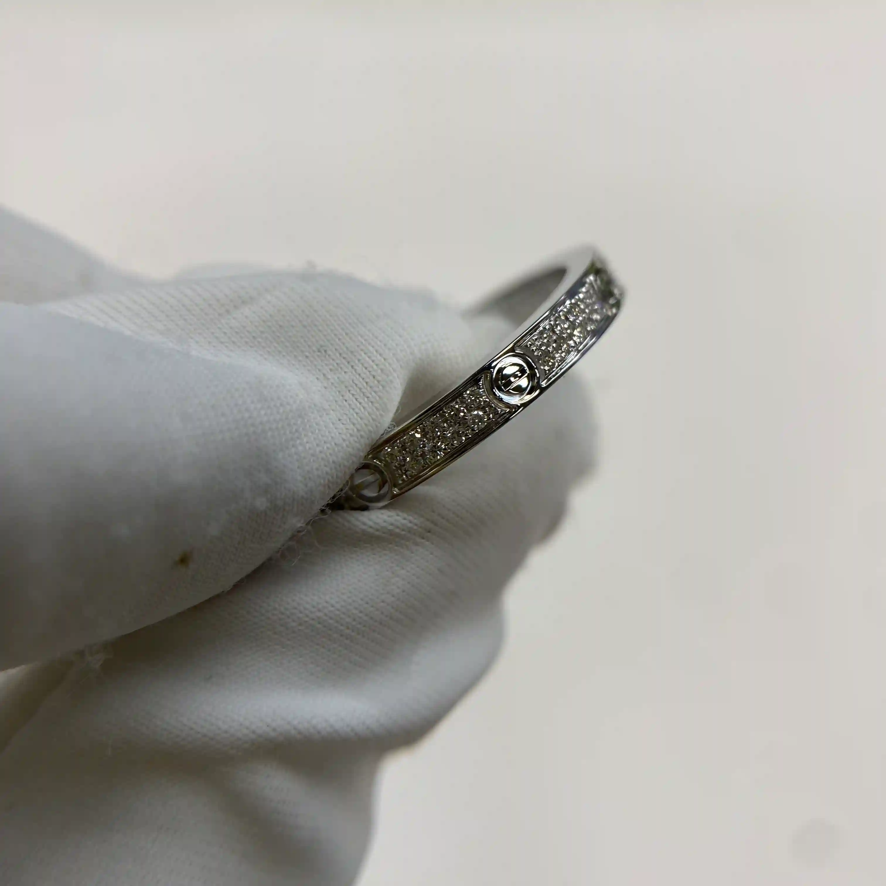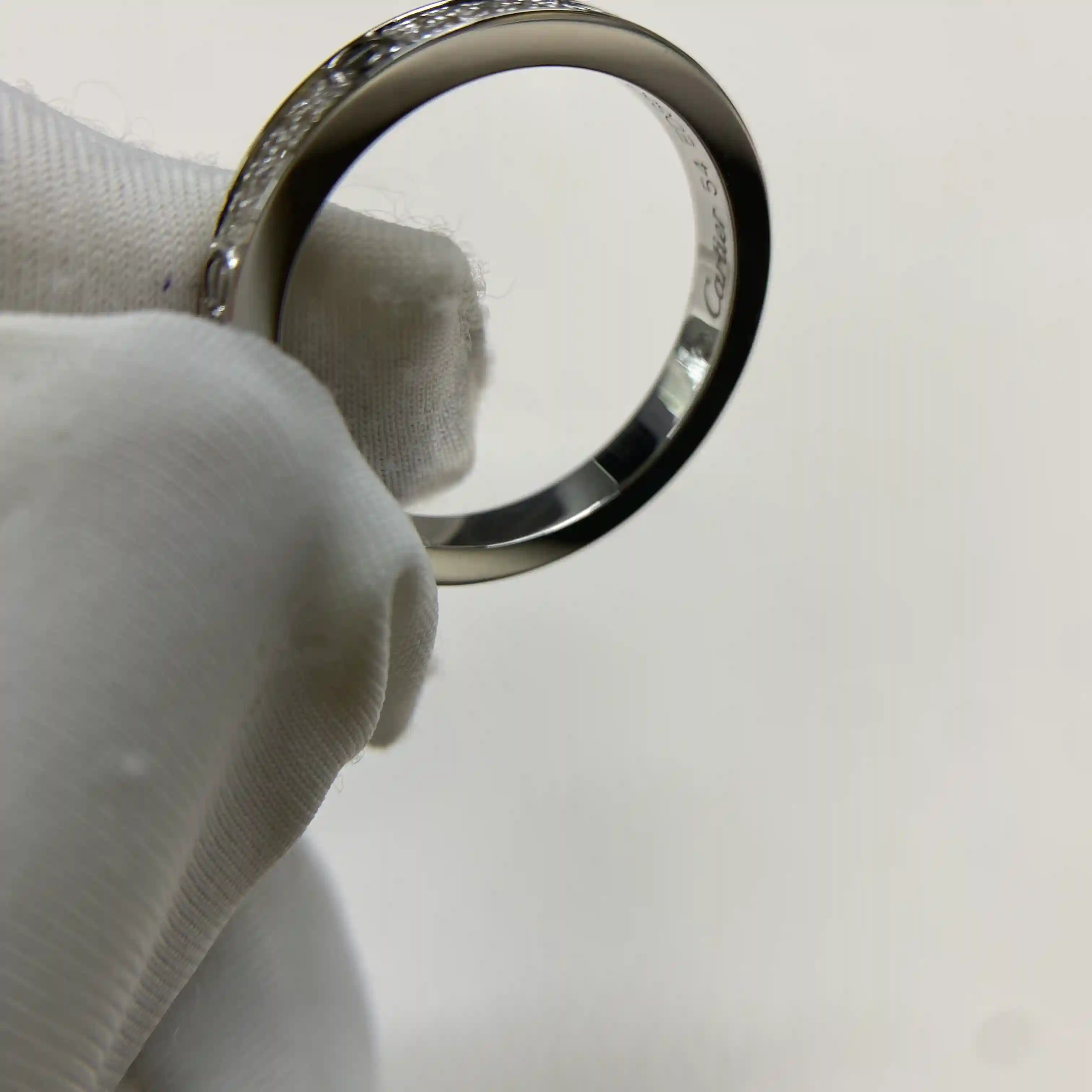 These 18K white gold Cartier love ring mini diamond are handcrafted by our experienced jewelry artisans and produced made to order, ensuring every piece is created using the latest craftsmanship techniques. This delicate mini band ring features the iconic screw motif in a slim and refined 2.6mm width, offering a modern and elegant interpretation of a classic design. Paved with 72 brilliant-cut diamonds totaling approximately 0.19 carats, it delivers a subtle yet continuous sparkle that enhances its minimalist silhouette. The slim profile makes it perfect for stacking with other rings or wearing alone for a clean, understated look, ideal for both everyday wear and special occasions.Crafted in solid 18K white gold, this ring provides lasting shine and durability while maintaining a lightweight, comfortable fit. As a factory-direct piece, it combines fine jewelry craftsmanship with a more accessible price point, offering exceptional value without compromising quality. Each detail is carefully polished to achieve a smooth, high-end finish. Whether chosen as a meaningful gift for a birthday, anniversary, or celebration, or as a personal staple piece, this ring is timeless, versatile, and effortlessly stylish.