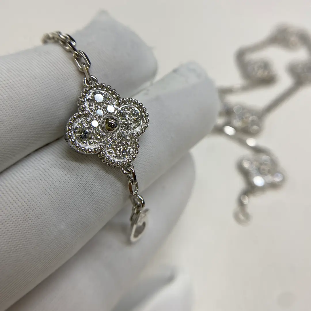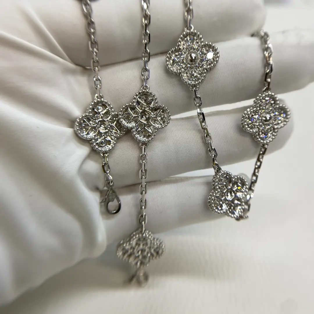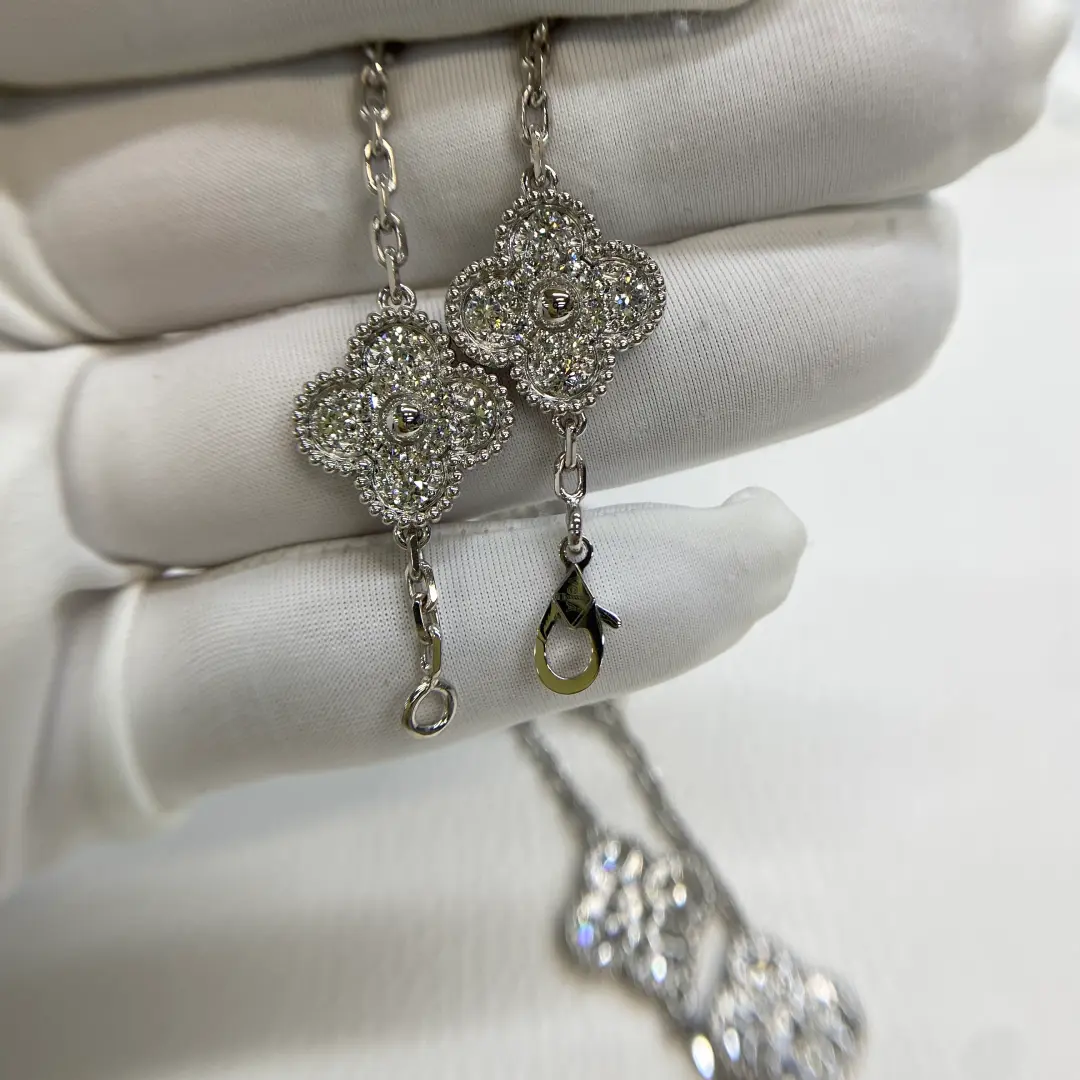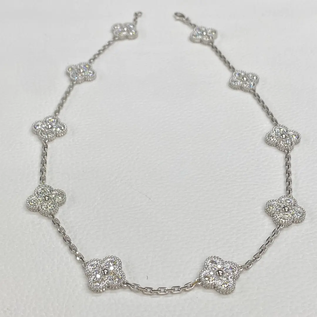These 18K White Gold Van Cleef 10 motifs Diamond Necklace are handcrafted by our experienced jewelry artisans and produced made to order, ensuring every piece is created using the latest craftsmanship techniques. Crafted from rhodium-plated 18K white gold, this Vintage Alhambra necklace features 10 elegant motifs set with round brilliant diamonds. The piece is adorned with 120 diamonds totaling approximately 4.83 carats, with diamond quality F color and VS clarity, offering exceptional brilliance and refinement. Designed with a hallmark clasp in 18K white gold (small model), the necklace has a chain length of approximately 16.54 inches, creating a timeless and sophisticated look suitable for both everyday elegance and special occasions.