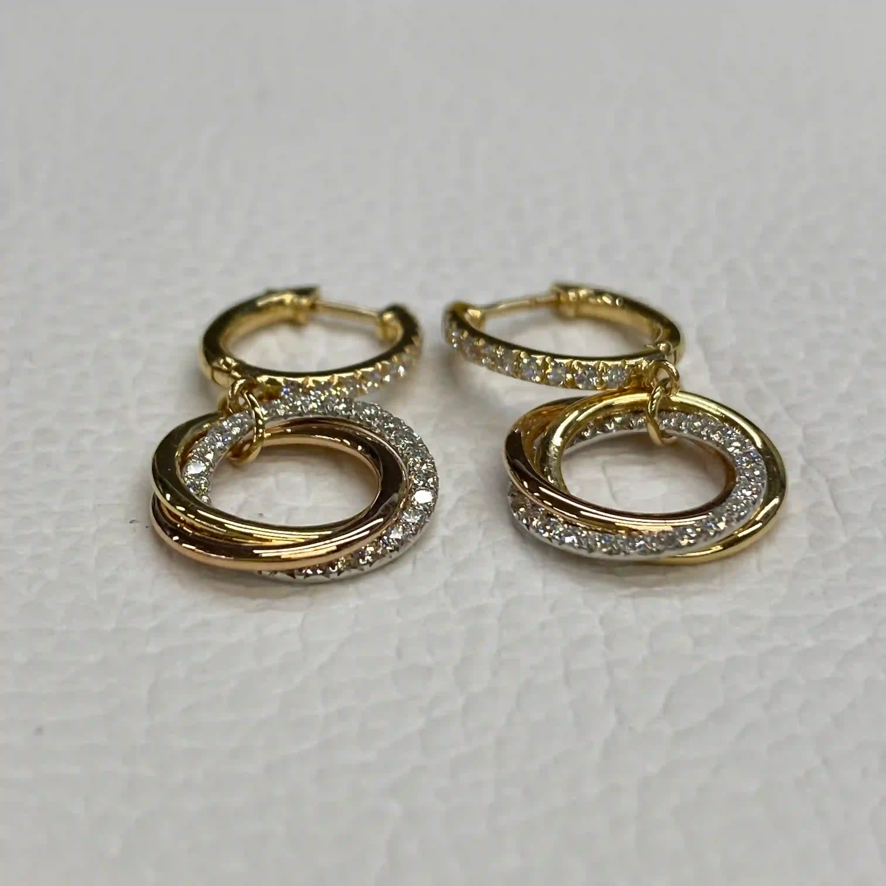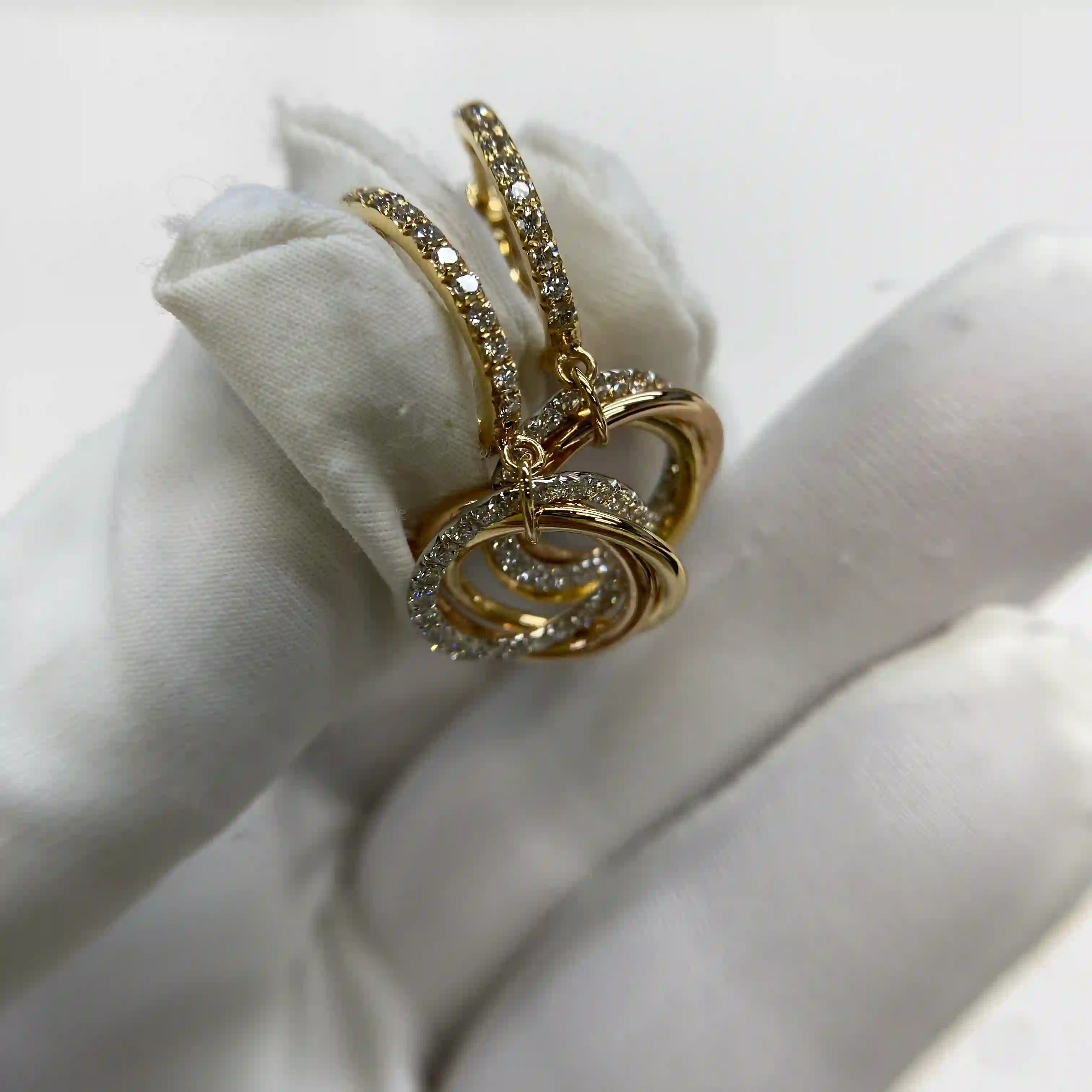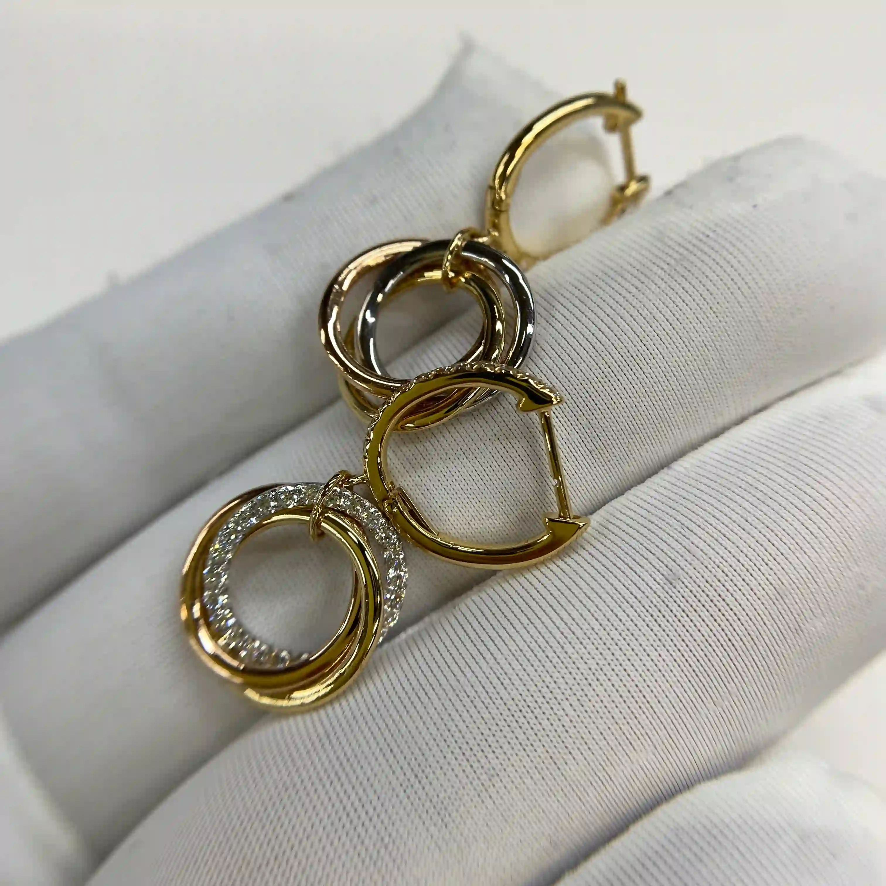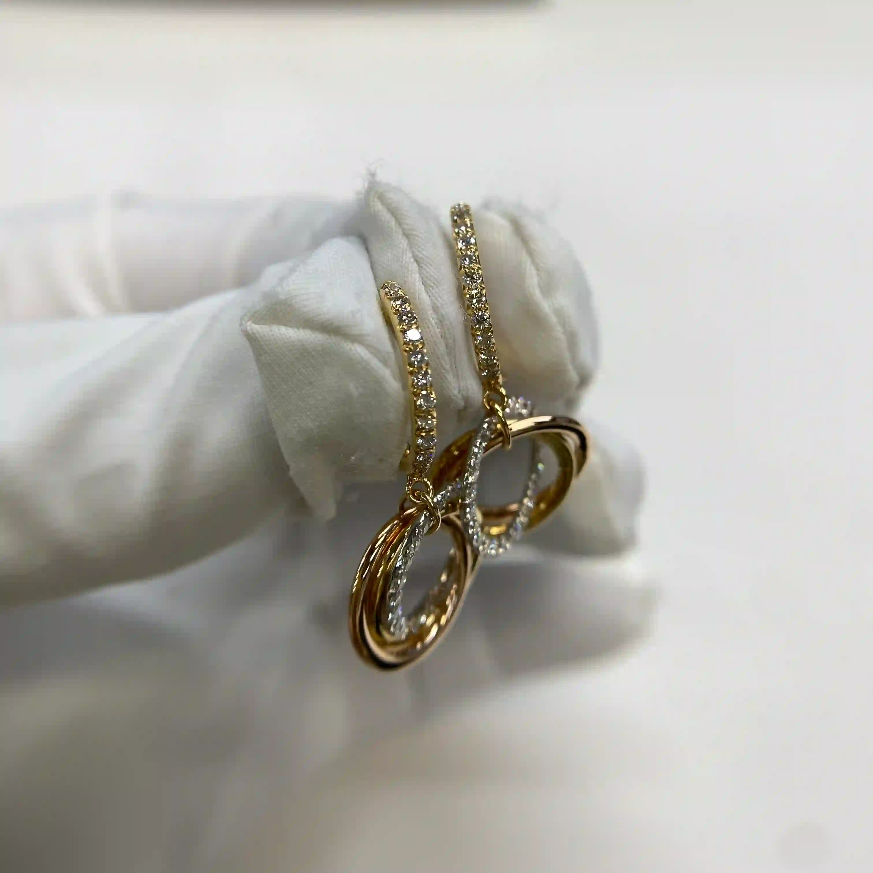 This Cartier trinity earrings 18K yellow gold half-paved are handcrafted by our experienced jewelry artisans and produced made to order, ensuring every piece is created using the latest craftsmanship techniques. Elevate your jewelry collection with these 18K yellow gold Cartier trinity earrings (Ref. B8301465), exquisitely adorned with 72 half-paved diamonds totaling 0.55ct. The iconic Trinity design features three intertwined bands, creating a harmonious balance of elegance and sophistication. Perfectly sized to catch the light, the pavé diamonds add a subtle yet captivating sparkle, making these earrings ideal for both everyday wear and special occasions.Crafted from genuine 18K yellow gold, this Cartier-inspired design combines timeless style with durability. At Allovey, we work directly with skilled artisans to provide factory-direct quality at competitive pricing, ensuring luxury craftsmanship without compromise. These half-paved Trinity earrings make an unforgettable gift for anniversaries, birthdays, or milestone celebrations, embodying love, elegance, and refined taste. Whether for yourself or a loved one, they are a versatile and cherished jewelry piece that elevates any collection.