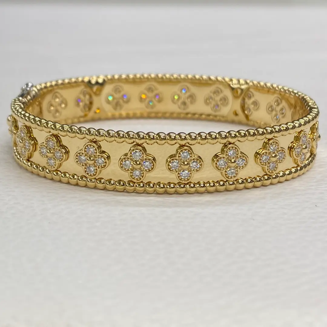 This 18K Yellow Gold Van Cleef perlee clover bracelet diamonds are handcrafted by our experienced jewelry artisans and produced made to order, ensuring every piece is created using the latest craftsmanship techniques. this clover diamond bracelet features a refined Perlée-inspired design with iconic clover motifs and 80 pavé-set round diamonds for exceptional brilliance. The polished beaded gold edges add a timeless and elegant touch, making it perfect for both everyday wear and special occasions. Crafted with a concealed box clasp for a seamless fit, each piece is meticulously handmade to ensure high-quality finish and durability. Offered at factory direct pricing, this bracelet delivers luxury at a better value and comes with a gold authenticity certificate, guaranteeing genuine 18K gold, an ideal choice for a sophisticated gift or custom jewelry collection.