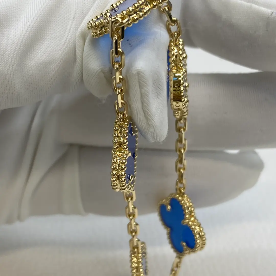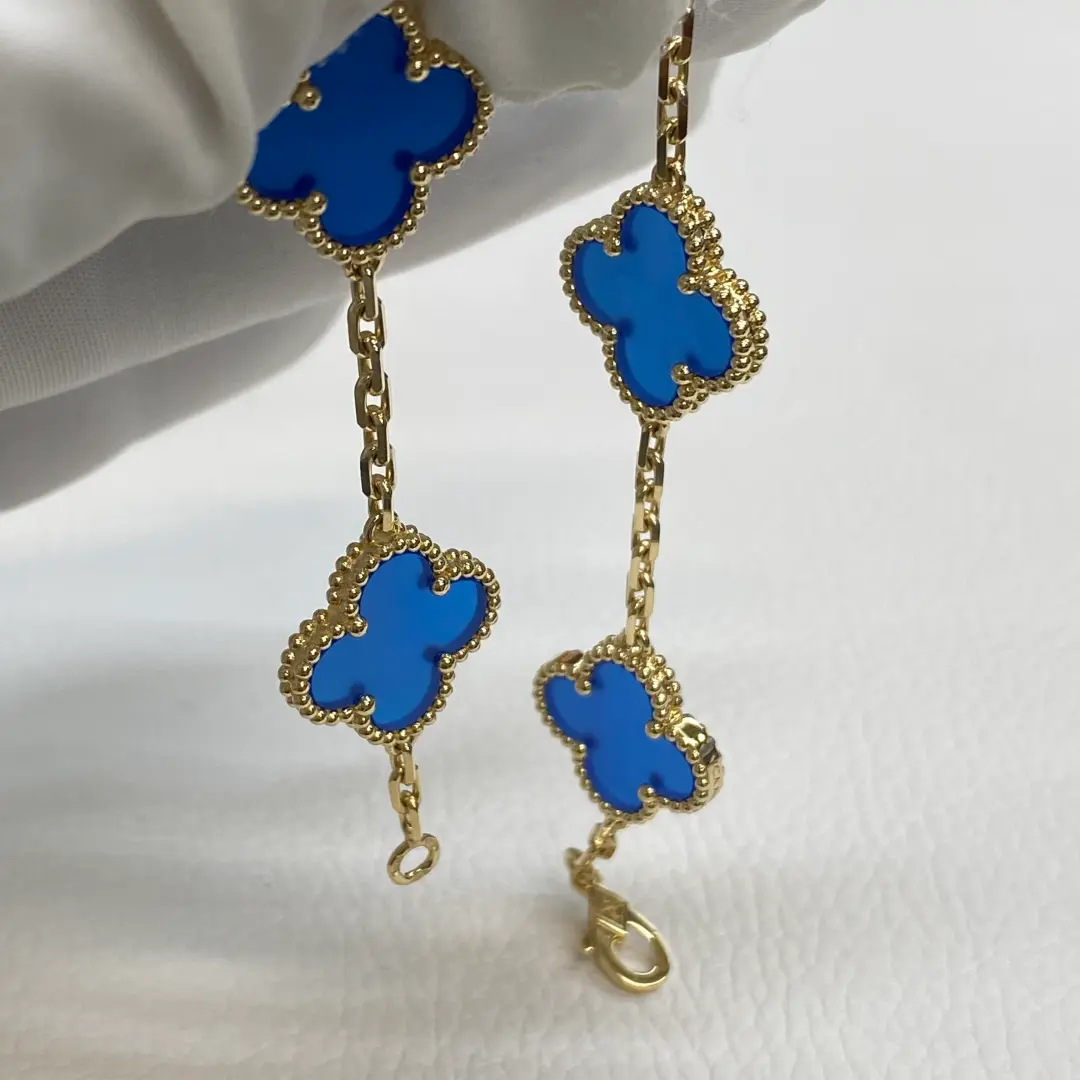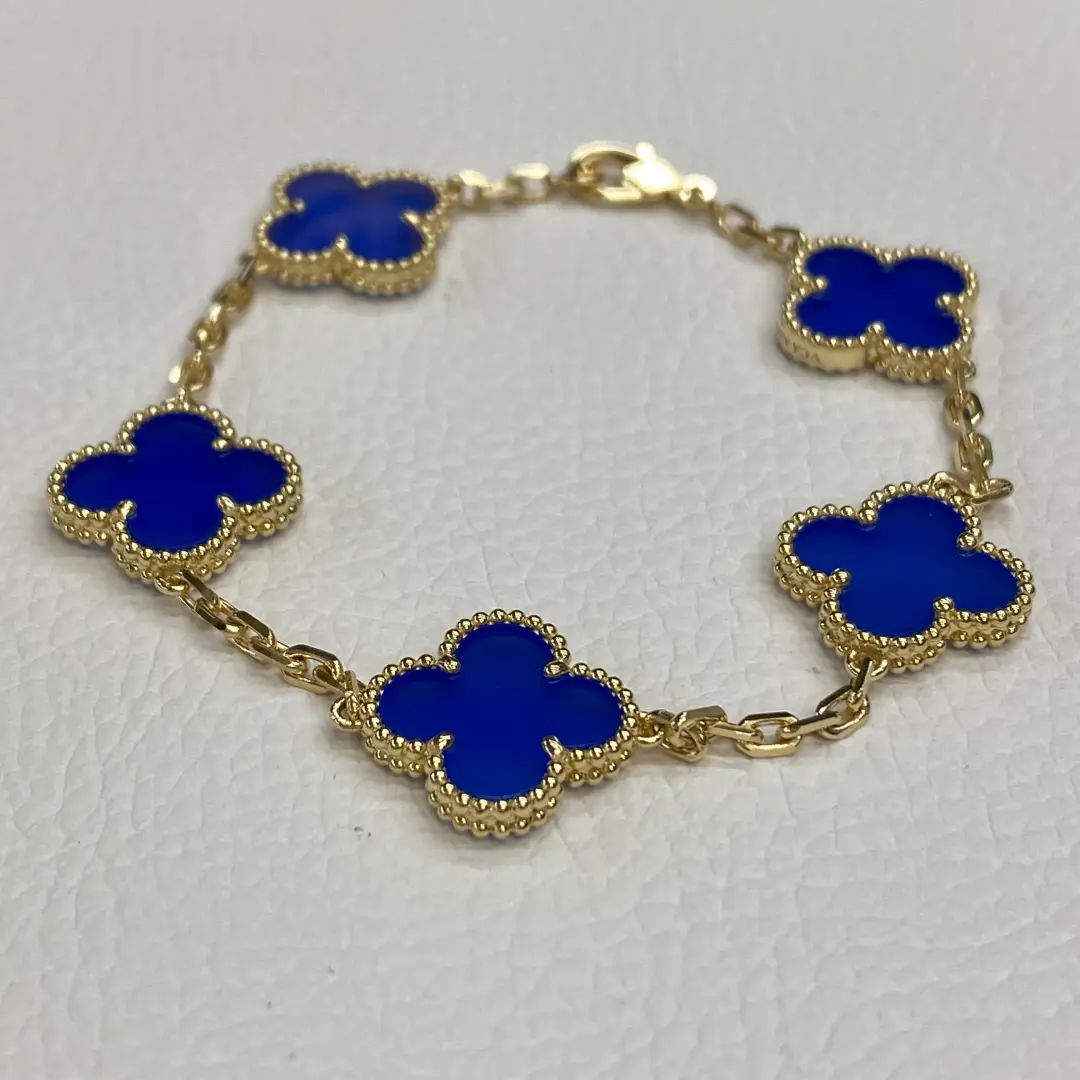 These 18K Yellow Gold Van Cleef vintage alhambra bracelet blue agate are handcrafted by our experienced jewelry artisans and produced made to order, ensuring every piece is created using the latest craftsmanship techniques. Crafted from 18K yellow gold, this Vintage Alhambra bracelet features five elegant motifs set with natural blue agate, creating a timeless and refined look. Each agate stone is natural and unique, so its color and patterns may vary slightly from one piece to another. In addition, the appearance of the stone can change under different lighting conditions and backgrounds, which is a natural characteristic of genuine agate. The bracelet is finished with a small model hallmark clasp in 18K yellow gold and measures approximately 7.48 inches in length. Customers are advised to be aware of these natural variations before purchasing.