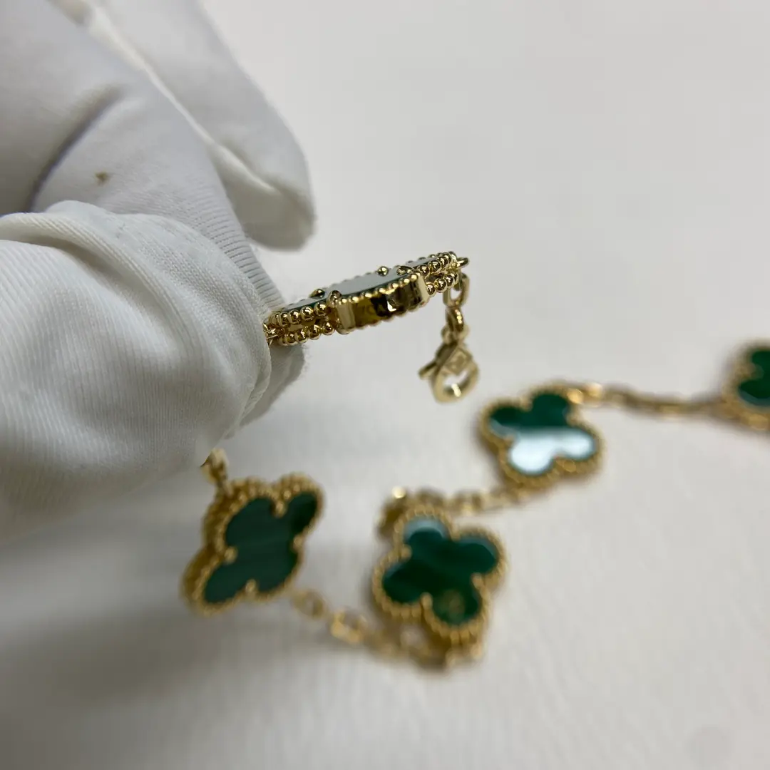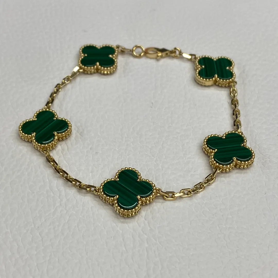 These 18K Yellow Gold Van Cleef vintage alhambra bracelet malachite are handcrafted by our experienced jewelry artisans and produced made to order, ensuring every piece is created using the latest craftsmanship techniques. 18K yellow gold malachite bracelet with 5 clover motifs, featuring natural green stones with unique patterns. Fine handcrafted setting with beaded edges, offering a timeless and elegant look. Lightweight and comfortable for daily wear or layering. High-quality custom jewelry with factory direct pricing, ideal as a luxury gift for her.