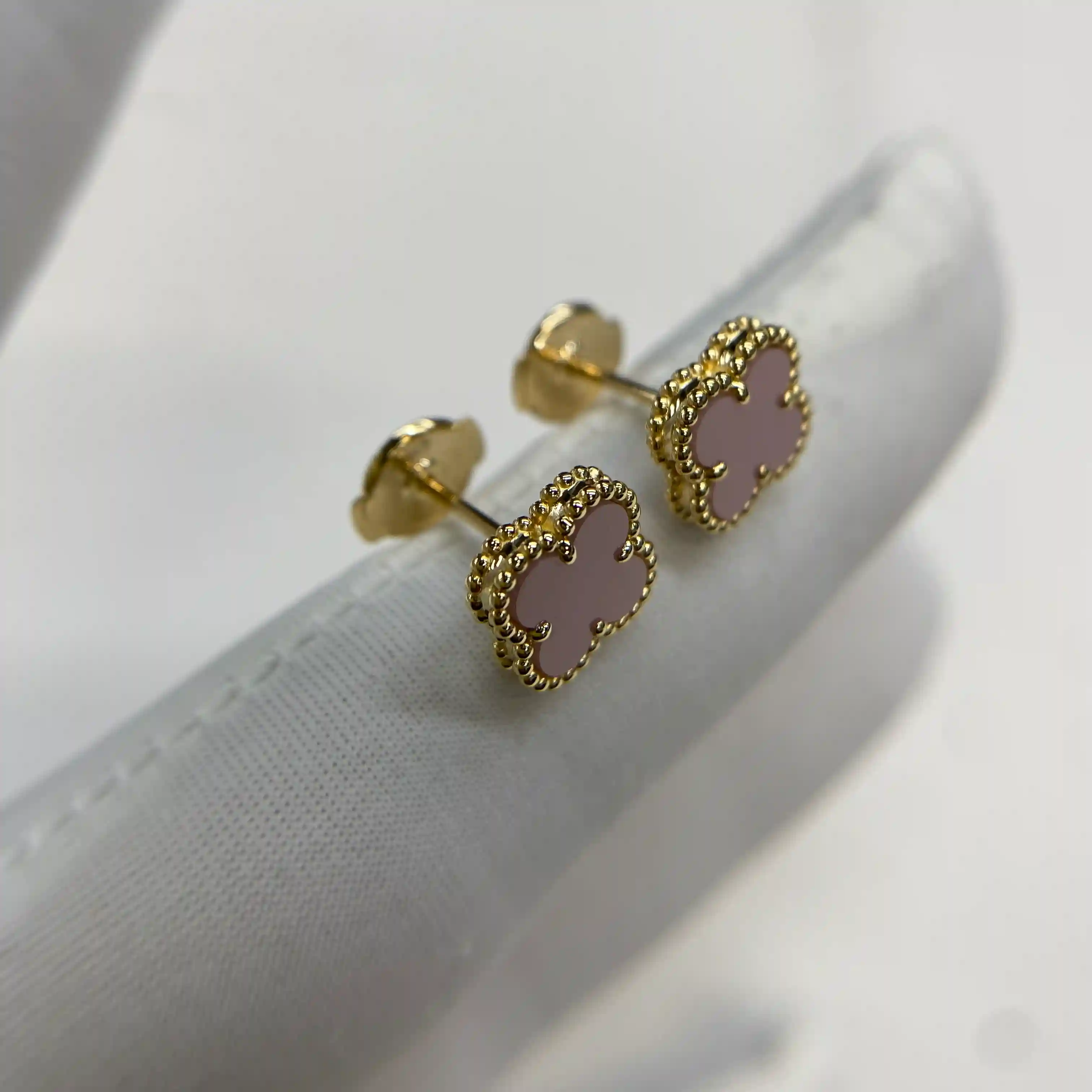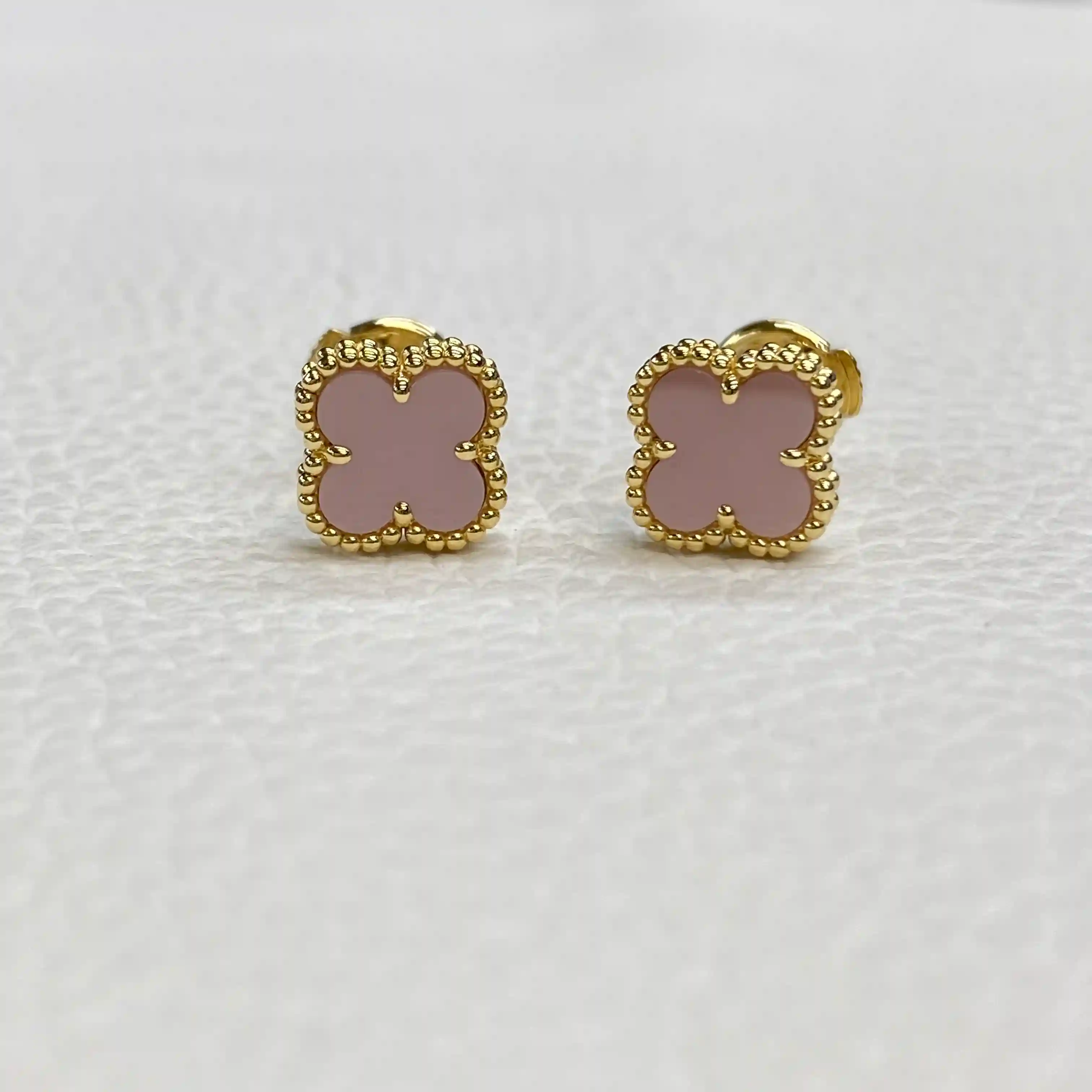 Custom 18K Yellow Gold Van Cleef Arpels Vintage Alhambra Pink Mother-of-Pearl Shell Earrings